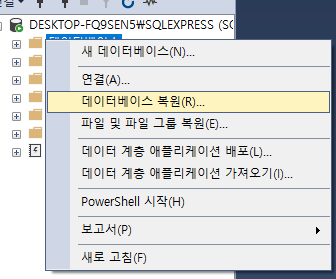 이후에 다운이 완료되면, SSMS에서 데이터베이스 우클릭 - 데이터베이스 복원