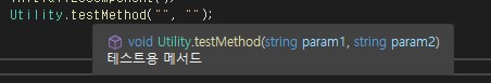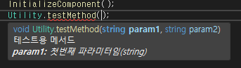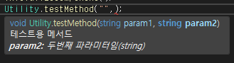 Utility.cs 클래스에 testMethod 라고 생성해준뒤, 위에서 /// (슬래쉬3번) 을 쳐주면 아래와같이 summary 구조가 자동으로 생성된다. 그리고 메서드의 제목에 대한 설명과 파라미터에 대한 설명을 아래와같이 적어주면 된다.